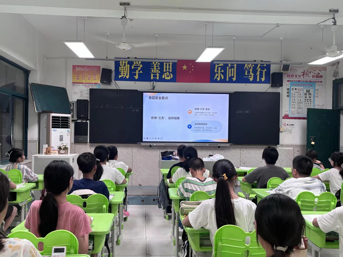 在“校园安全”环节,学生代表演示了“课间三步走”:先观察、再慢行、后礼让;体育委员带领全班重温“体育课四检查”——检查场地、器材、服装、热身,确保运动安全。
