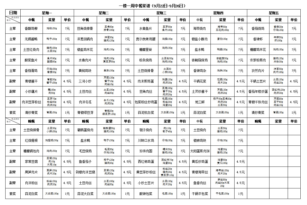 合肥新康中学食堂一周菜谱(9月15日-9月19日)