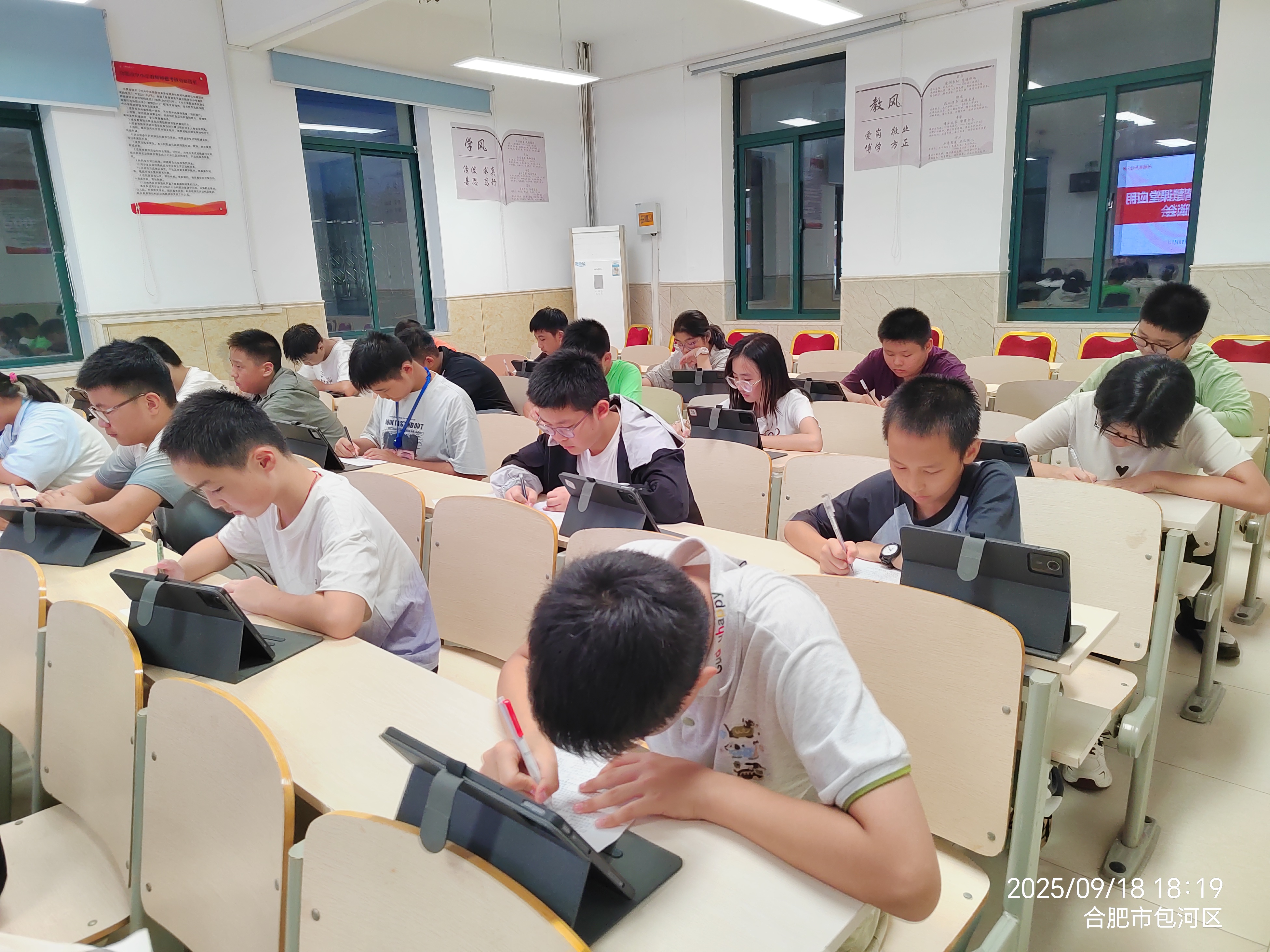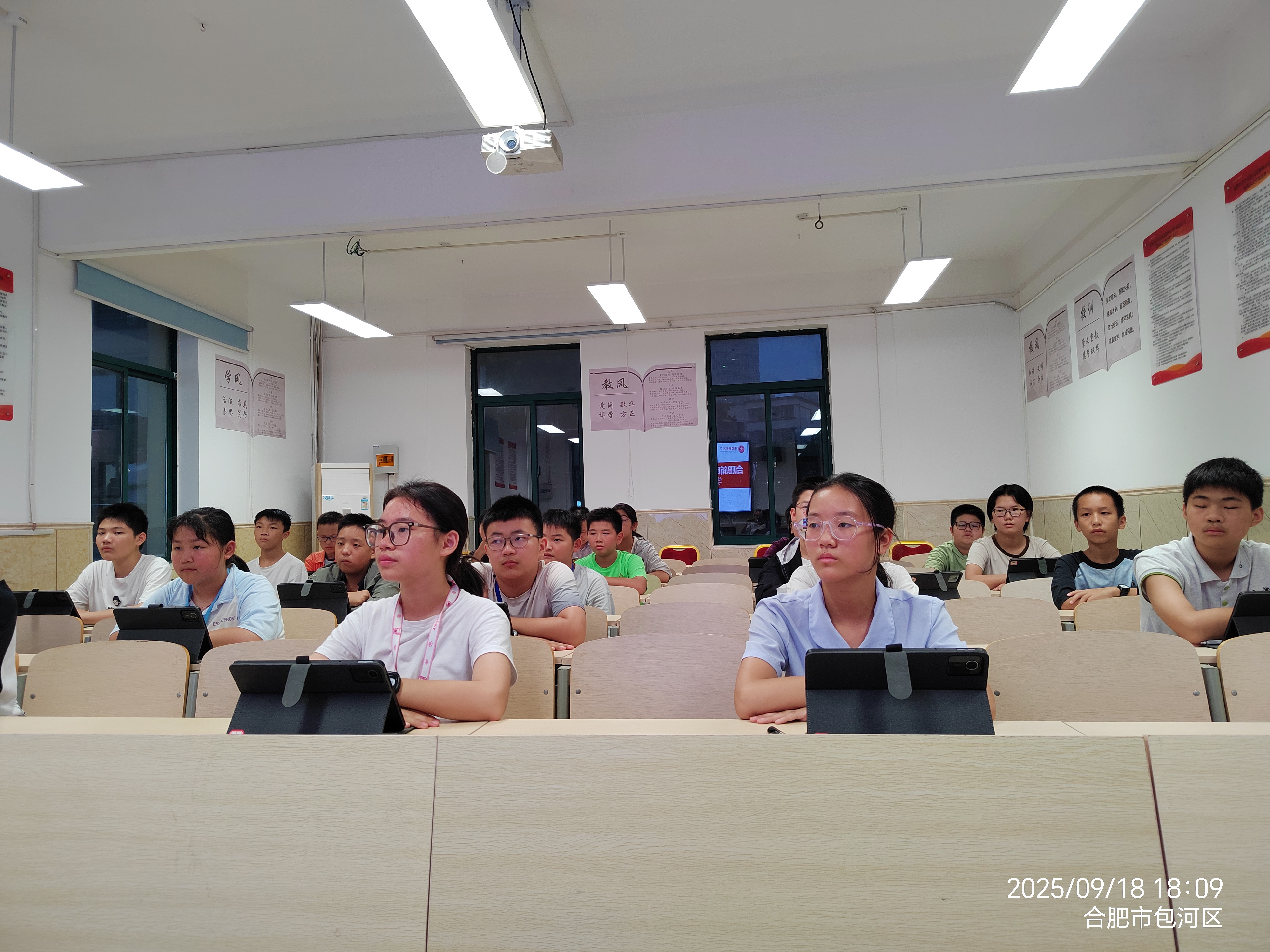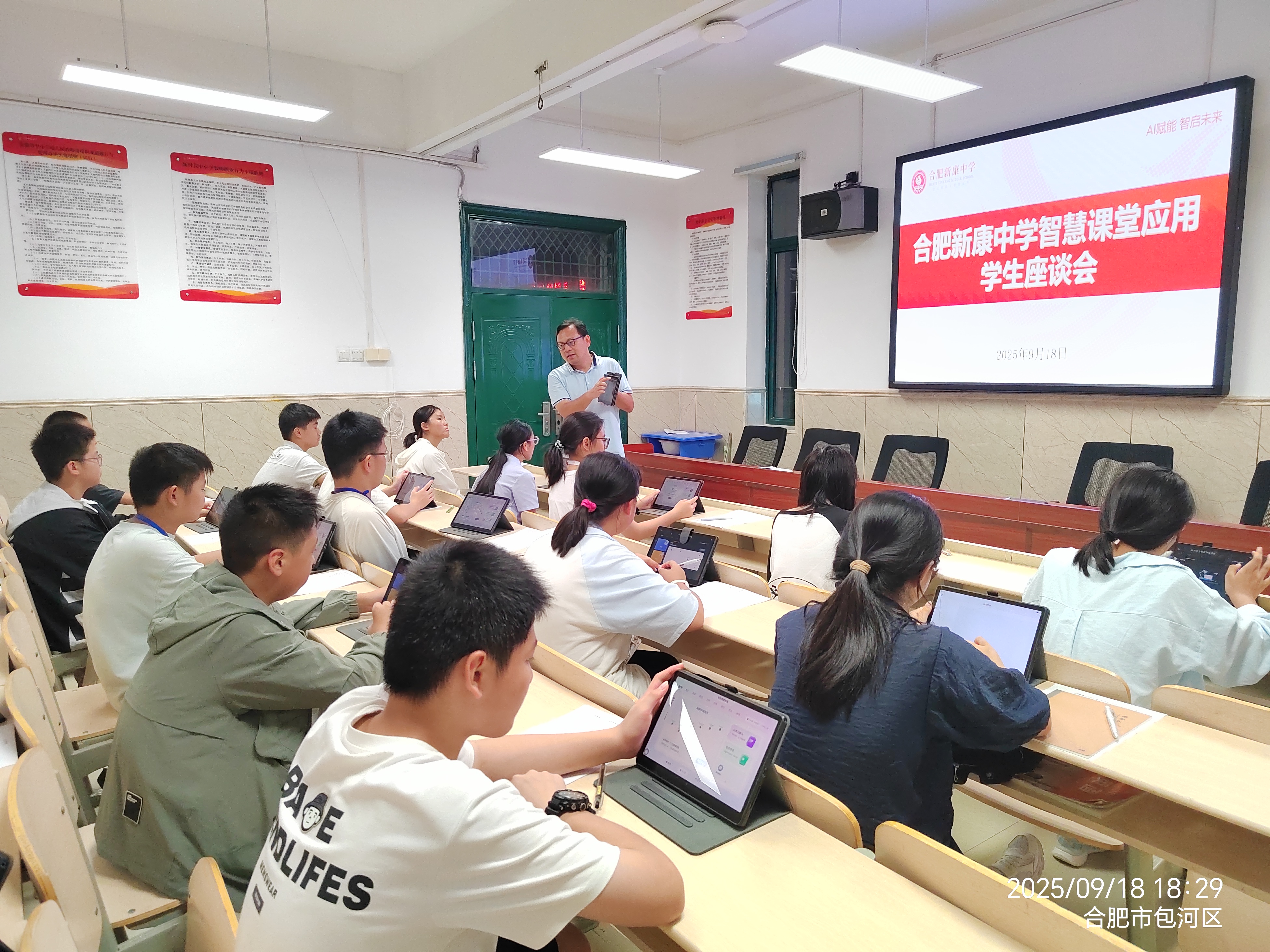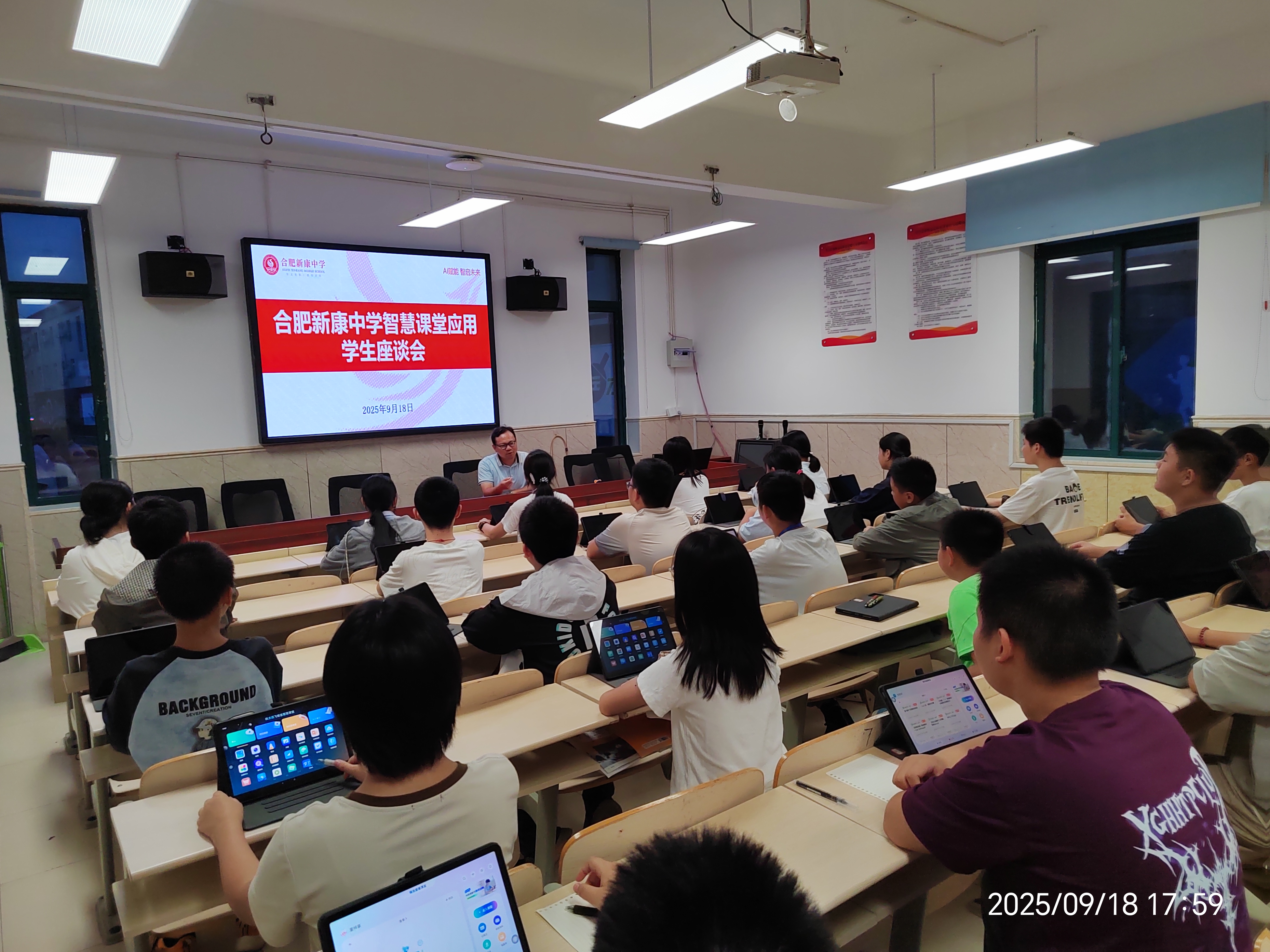 2025年9月18日,合肥新康中学初中部在龚红卫校长的主持下,召开了一场别开生面的智慧课堂学生座谈会。此次会议的核心目标在于深入探查智慧课堂平板在实际教学中的运用成效,进一步挖掘平板在教学中的辅助功能,以优化课堂教学模式,并强化课后学习的提升效果。教务处精心安排,从每个班级随机抽取五名同学参与此次座谈会,围绕平板使用的现状、学习成效以及未来的优化方向展开深入的调研与交流。