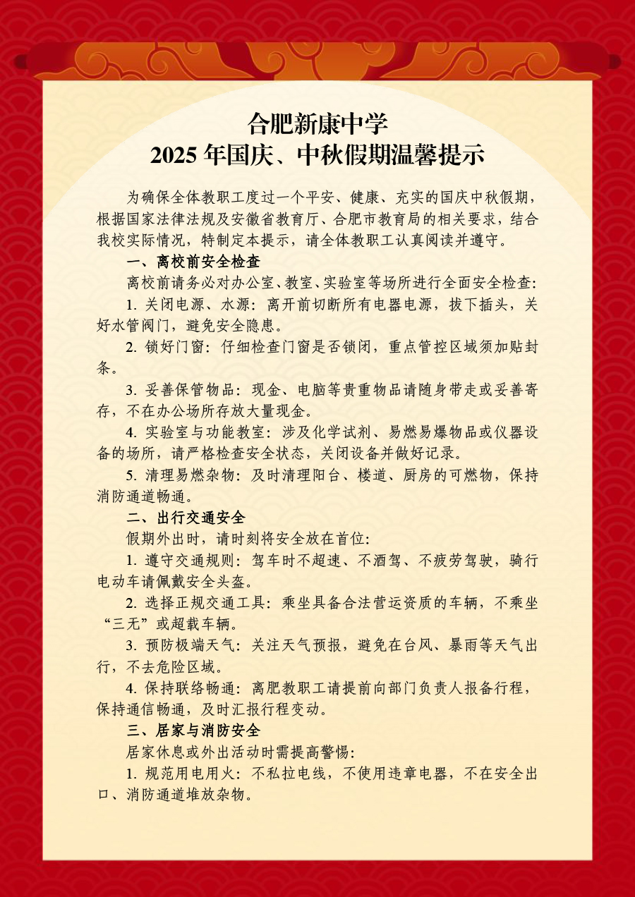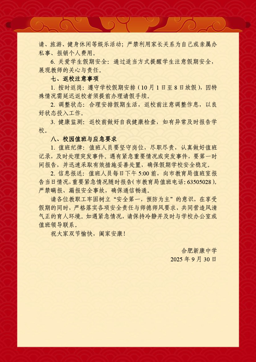 合肥新康中学2025年国庆中秋假期致全体学生及家长的一封信