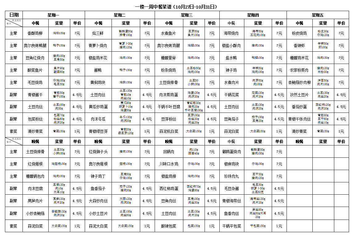 合肥新康中学食堂一周菜谱(10月20日-10月24日)