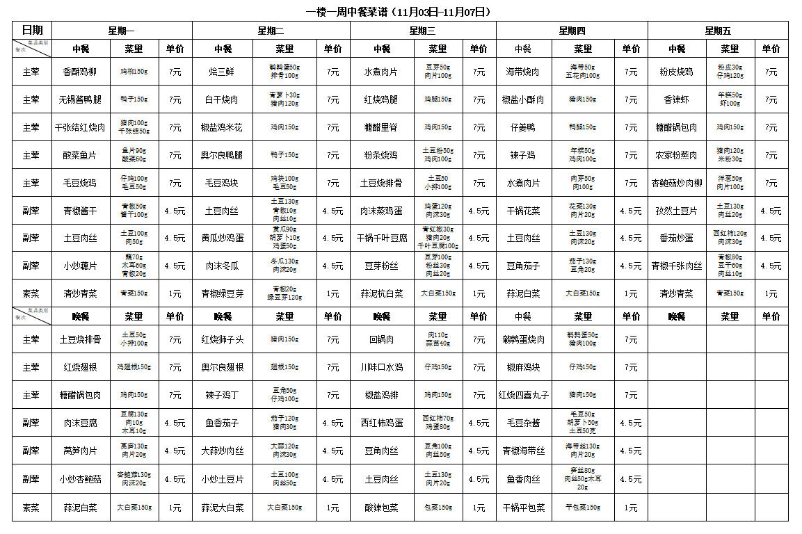 合肥新康中学食堂一周菜谱(11月10日-11月14日)