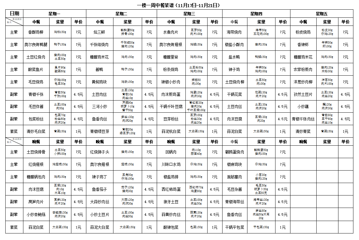 合肥新康中学食堂一周菜谱(11月24日-11月28日)