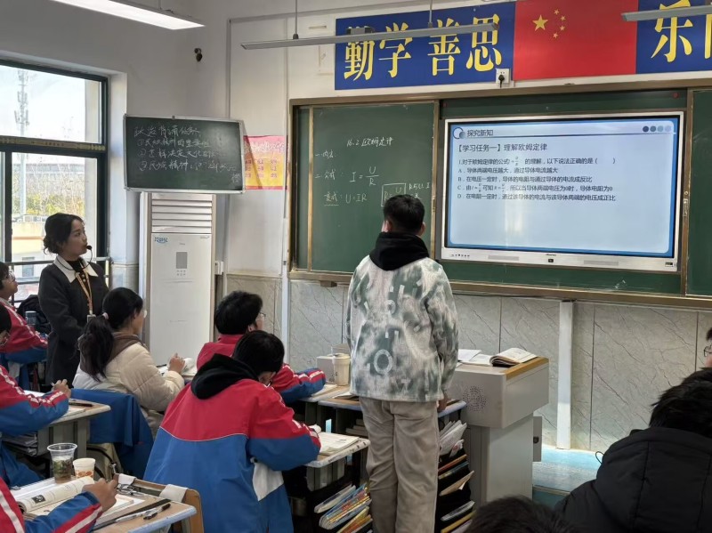 2025年11月18日上午第一节课,骆家敏老师在九2班开展《16.2欧姆定律》新课公开视导课,顾明指导及初高中理化组全体教师参与听课与评课。