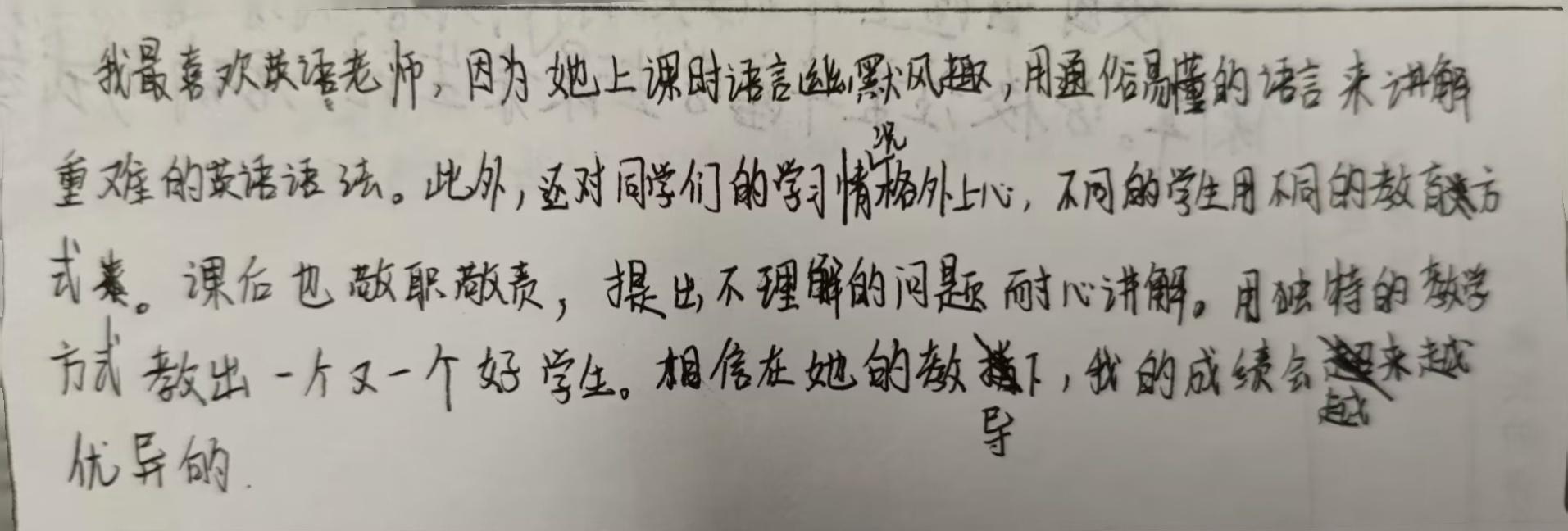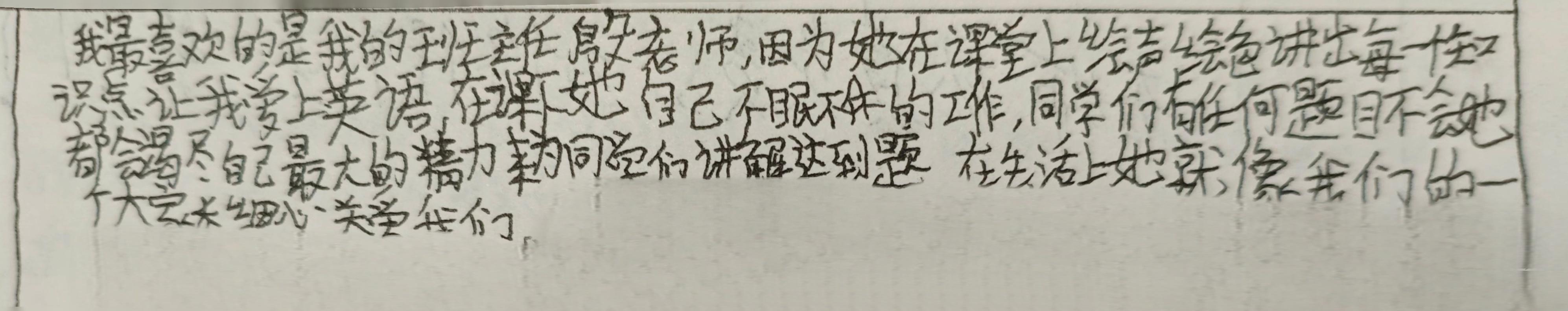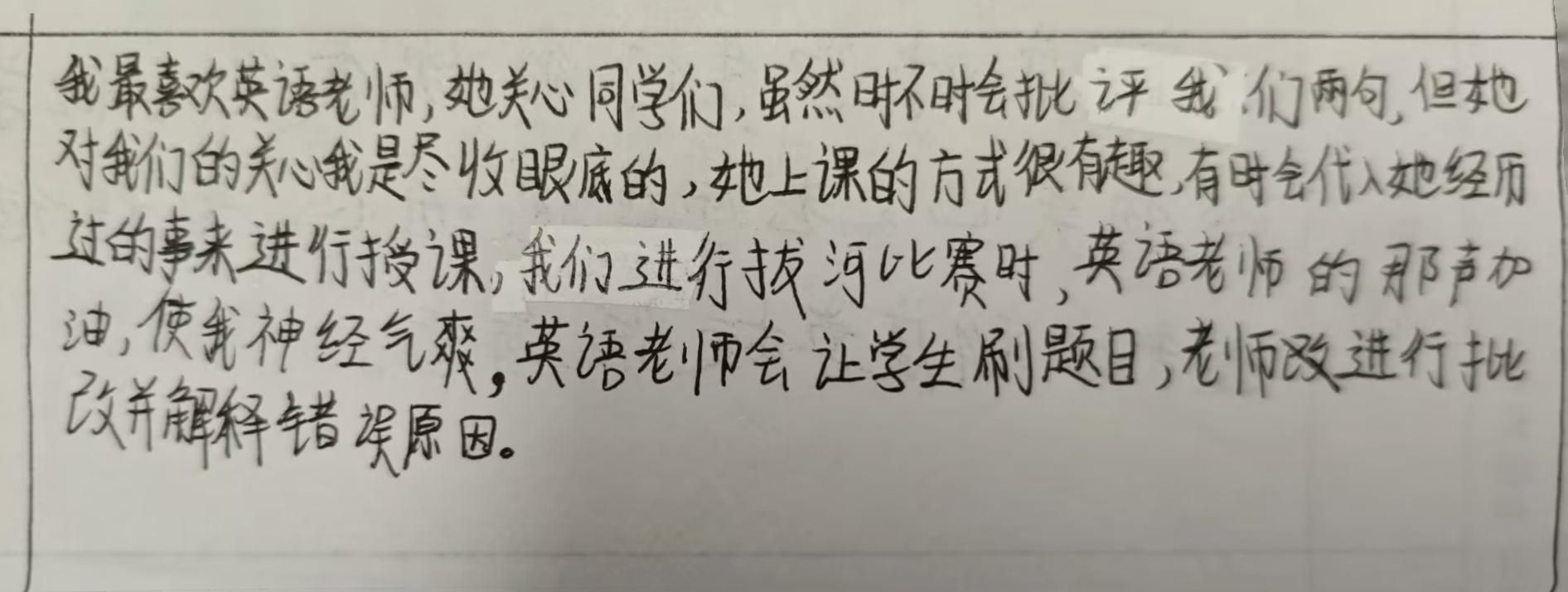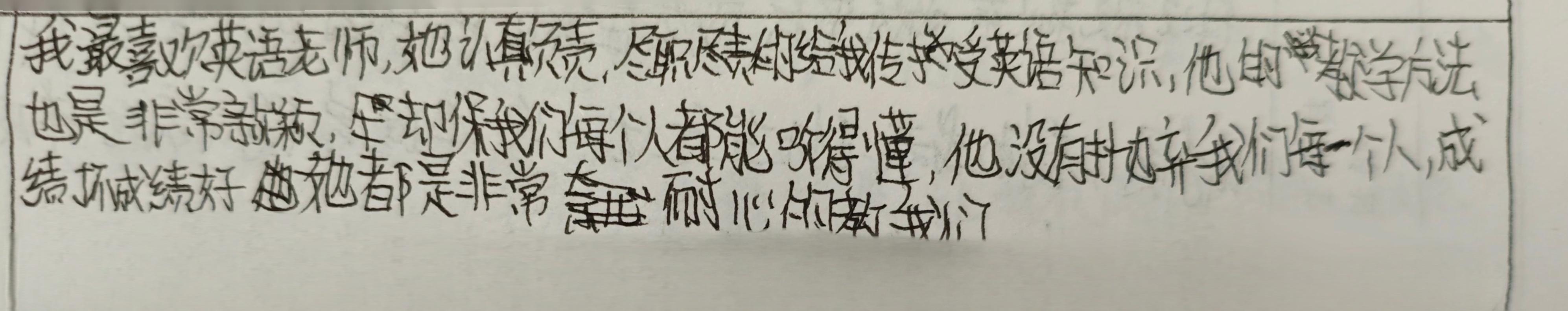 我最喜欢殷老师。因为她工作认真负责,每天监督我们读背单词、读背课文等。遇到不会的题她也会耐心讲解,平时她对我们十分温柔,可在我们犯错时也会露出严厉的一面。她像一位母亲一样爱护我们、关爱我们,让我在这里感受到了家的温暖。