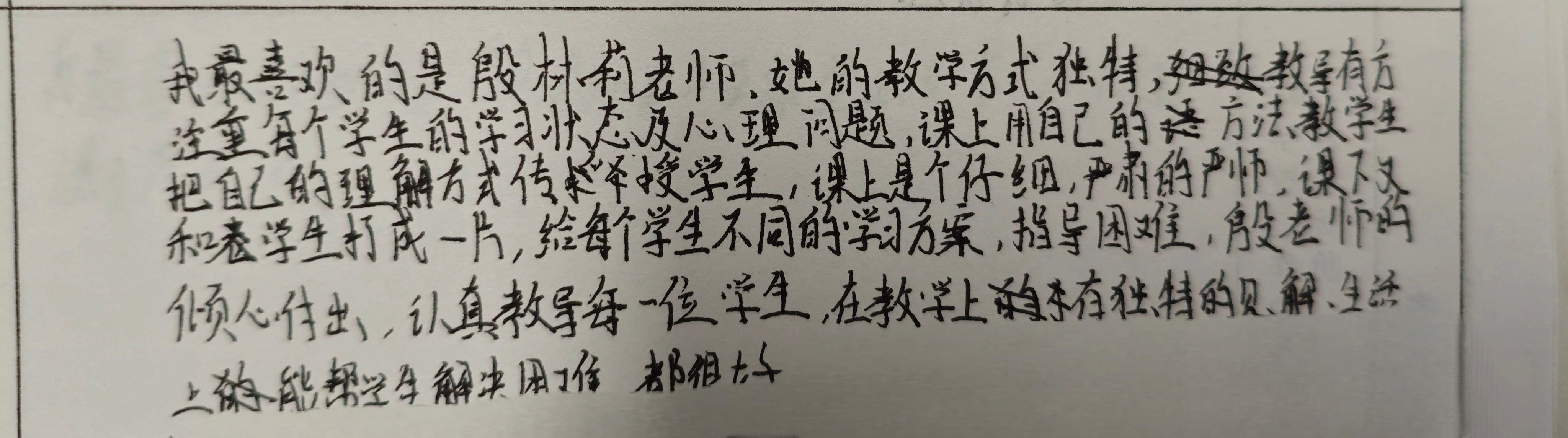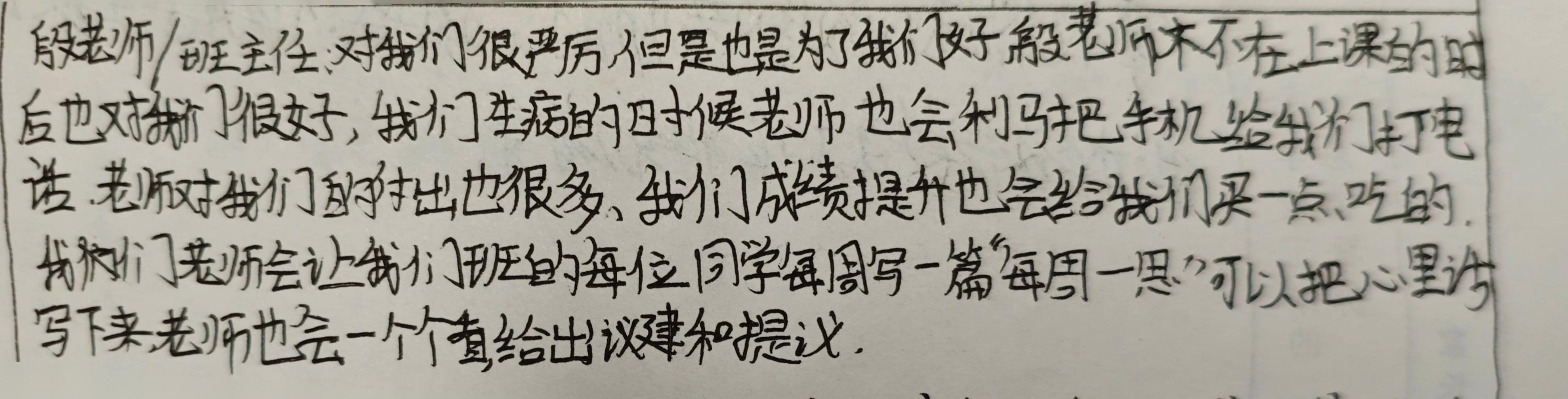 殷老师/班主任,对我们很严厉,但是也是为了我们好。殷老师课下的时候也对我们很好,我们生病的时候老师也会立马把手机给我们打电话。老师对我们的付出也很多,我们成绩提升也会给我们买一点吃的。我们老师会让我们班的每位同学每周写一篇“每周一思”,可以把心里话写下来,老师也会一个个查,给出建议和提议。
