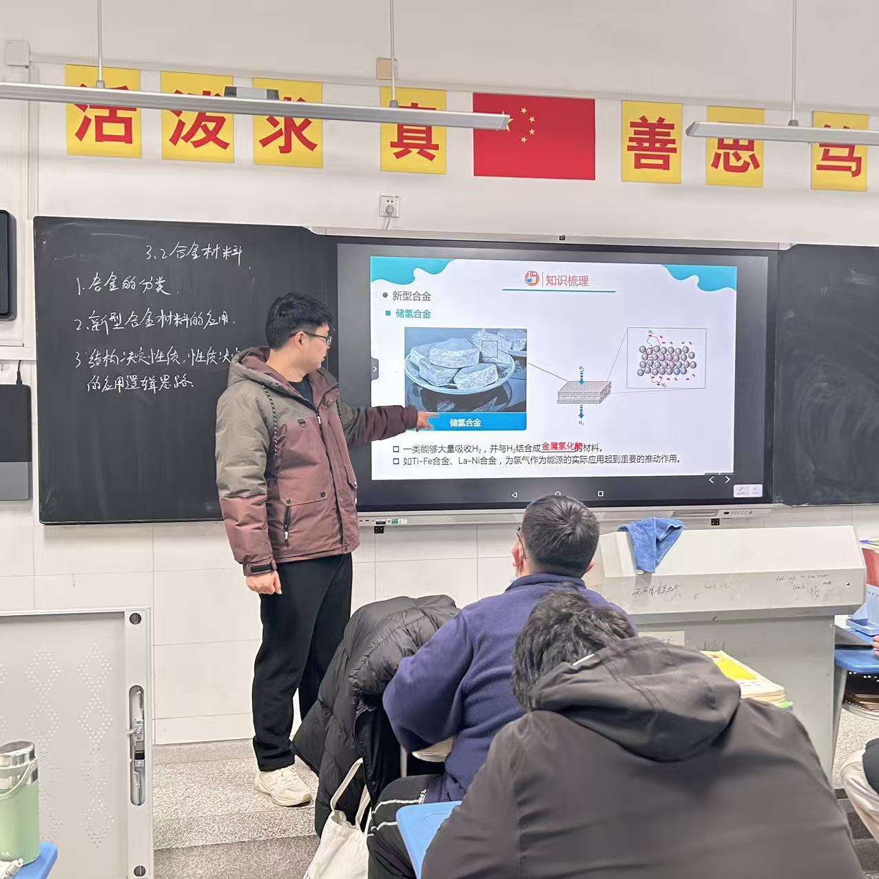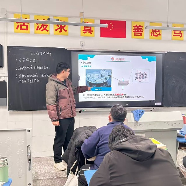 本节课聚焦于“合金”主题。苏贵阳老师不仅系统讲授了合金的定义、分类,并借助实物与示意图,引领学生认识了钢、铝合金、钛合金、形状记忆合金等多种常见材料,进一步从原子排列与晶体结构的微观视角,解析合金成分如何影响其硬度、强度、耐腐蚀性及特殊功能,生动印证了“结构决定性质”这一材料学根本法则。纯金属的强度局限、不锈钢的抗腐蚀机理、记忆合金的形状恢复能力——这些问题的答案,都在对微观世界的剖析中清晰呈现。