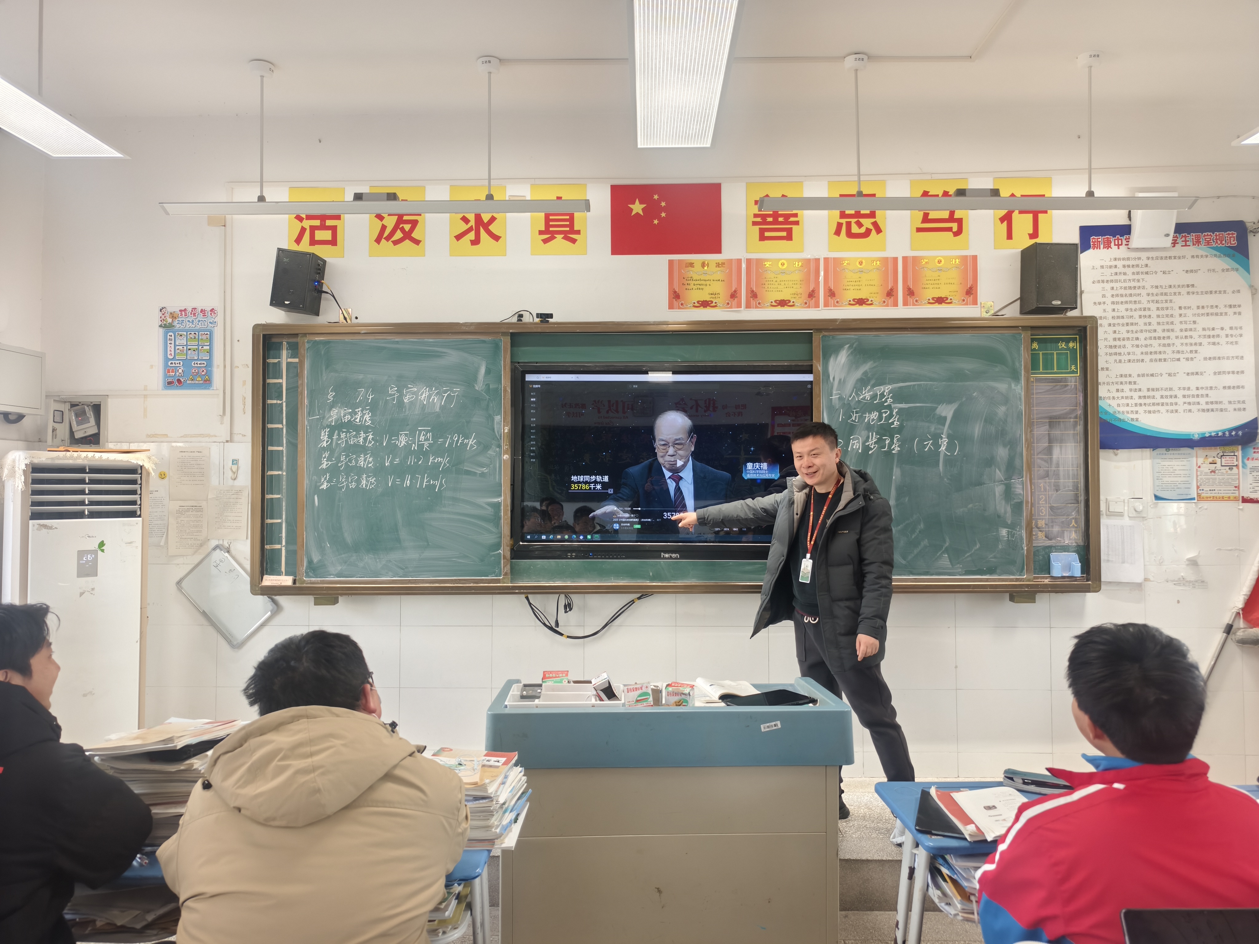 课堂从一段科学晚会的视频开始。航天发射、卫星运行、深空探测的画面,配合机器人领域的科技突破,迅速点燃了课堂氛围。视频结束后,樊老师顺势提问:“如何将一颗卫星精准送入轨道?”——这一问题,牵引出一堂围绕“三大宇宙速度”展开的物理课。