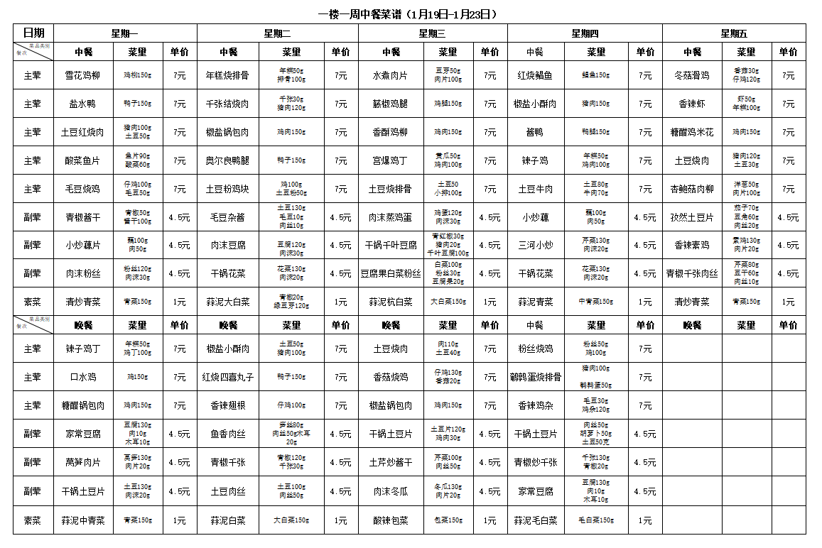 合肥新康中学食堂一周菜谱(1月12日-1月16日)