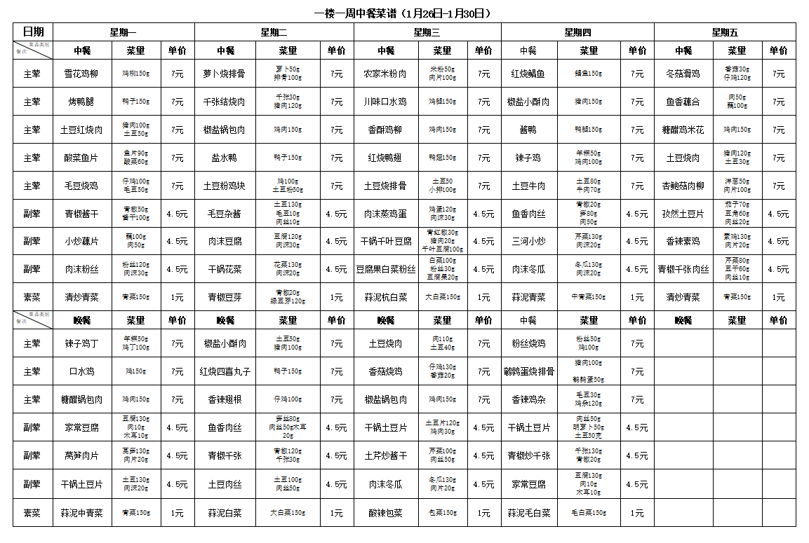 合肥新康中学食堂一周菜谱(1月19日-1月23日)