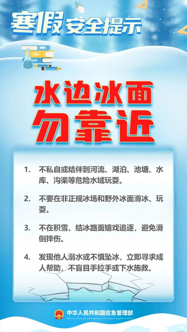 享受快乐假期,也要紧绷安全弦。谨慎用火用电、注意居家安全、遵守交通规则、警惕冰上危险……这份寒假安全提示,师生家长一起来了解——