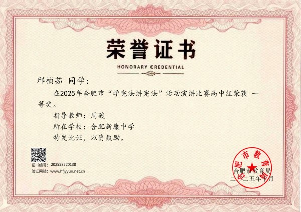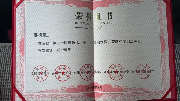本次开学典礼由高二4班邢桢茹同学主持,邢同学荣获2025-2026学年度第一学期合肥市演讲比赛一等奖,合肥市普通话大赛二等奖。