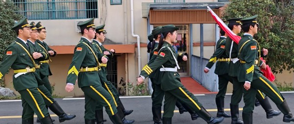 在全体师生的肃立注目下,国旗护卫队迈着铿锵有力的步伐护送国旗入场。伴随着雄壮的国歌声,鲜艳的五星红旗冉冉升起,迎风飘扬。全体师生行注目礼,心中激荡着对祖国的热爱和对新学期的憧憬。